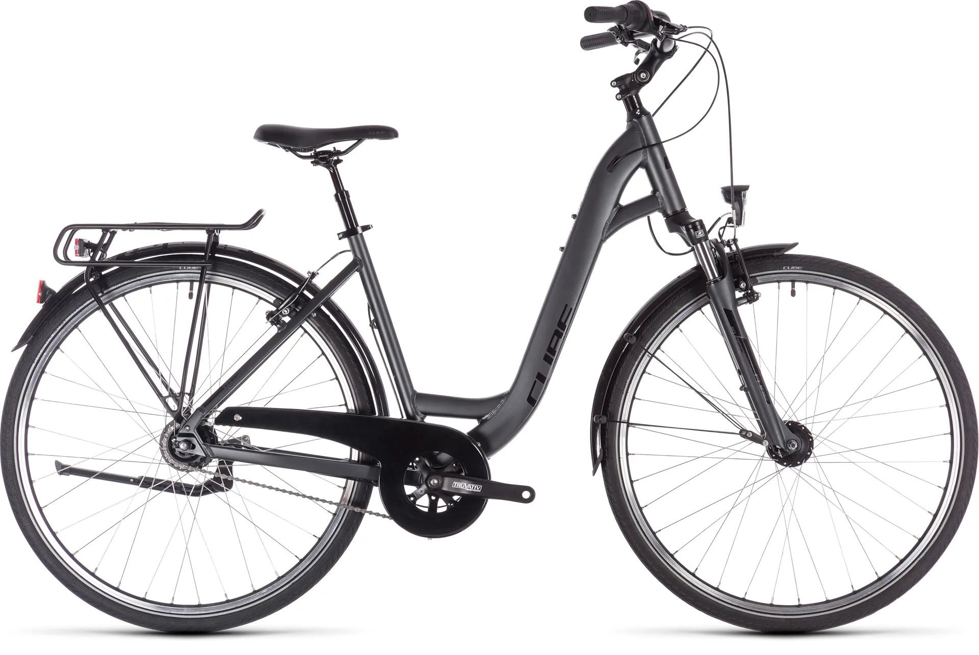 The Town Pro's light, stable aluminium frame features the same kind of double butted Superlite tubes that we use in many of our more expensive bikes. They're there to save weight where it's not needed, making for an easier and more comfortable ride without compromising strength or durability. The refined luggage carrier is stable and sleek, so you can just strap on your load and go. Internal cable routing reduces maintenance, and we built two different versions - a classic double diamond men's frame and a step-through frame for easy entry. Featuring a stiff, light and strong main frame tube manufactured using our advanced hydroforming process, it's as refined and comfortable as you'd expect from a CUBE.