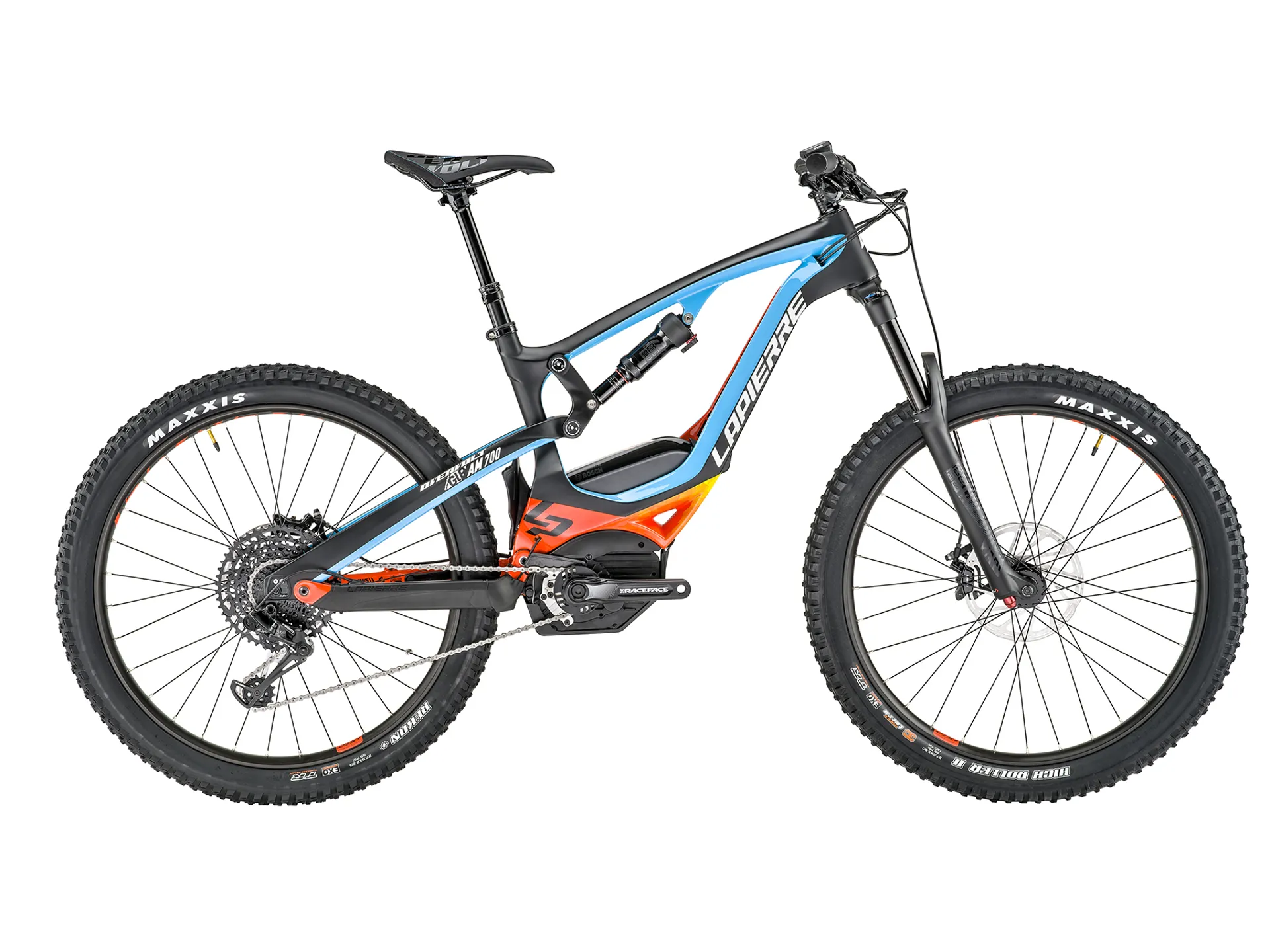 Frame : OVERVOLT GRAVITY LOGIC OST+ 160mm BOSCH CARBON BOOST Fork : ROCKSHOX YARI MOTION CONTROL 29'' BOOST 15x110 150MM TRAVEL Shock Absorber : ROCKSHOX DELUXE RT 210X55 DEBONAIR Headset : FSA Orbit 1.5 ZS NO.57SC Crankset : RACE FACE AEFFECT EBIKE 16T 165mm + CHAINGUIDE Stem : LAPIERRE CNC Ø: 31.8mm L: 45mm Seatpost : LAPIERRE DROPPER + TRIGGER Ø: 31.6mm travel: 100mm(S) 125mm(M,L) Handlebar : LAPIERRE ALLOY 6061DB W: 760mm R: 15mm Ø: 31.8mm Rear derailleur : SRAM GX EAGLE 12spd Brakes : SRAM GUIDE RE - SRAM CENTERLINE 200mm/ 200mm Shifters : SRAM GX EAGLE SINGLE CLICK 12s Saddle : LAPIERRE by VELO Wheel : FORMULA SEALED BEARINGS 15x110 BOOST 32H - FORMULA SEALED BEARINGS 12x148 BOOST SHIMANO DRIVER 32H - LAPIERRE eAM+ 32H 584-35c Sprocket : SRAM NX EAGLE 11-50T 12spd Tires : MAXXIS 27.5x2.8 HIGH ROLLER II EXO 3C MAXTERRA/ REKON+ EXO PROTECTION TUBELESS READY Motor : BOSCH PERFORMANCE CX 500Wh PURION Weight : 23,2 Size : S, M, L