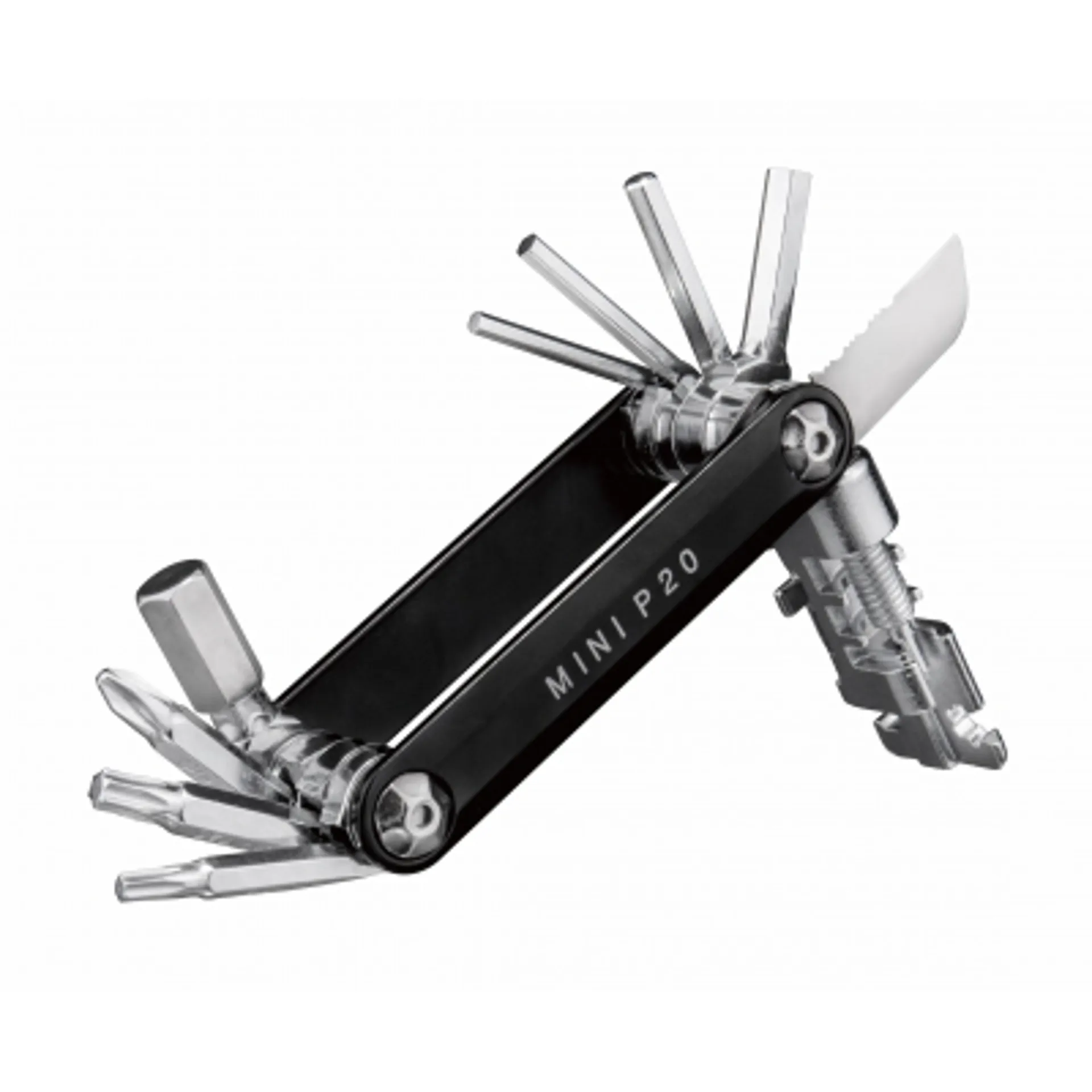 20 function pro-quality, precision mini tool with sleek forged alloy body. Integrated easy-to-use chain tool combined with a unique power link tool which folds away for a streamlined profile. Perfect for long road rides or endurance mountain biking. Includes a neoprene bag for protection.